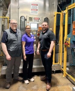 Frank Seago (right), general manager of Superior Health Linens, is joined by production supervisor Elvia Conchi and Nick Garrie of Gurtler Industries who handles their chemical wash supplies, in front of the LAVATEC tunnel washer.